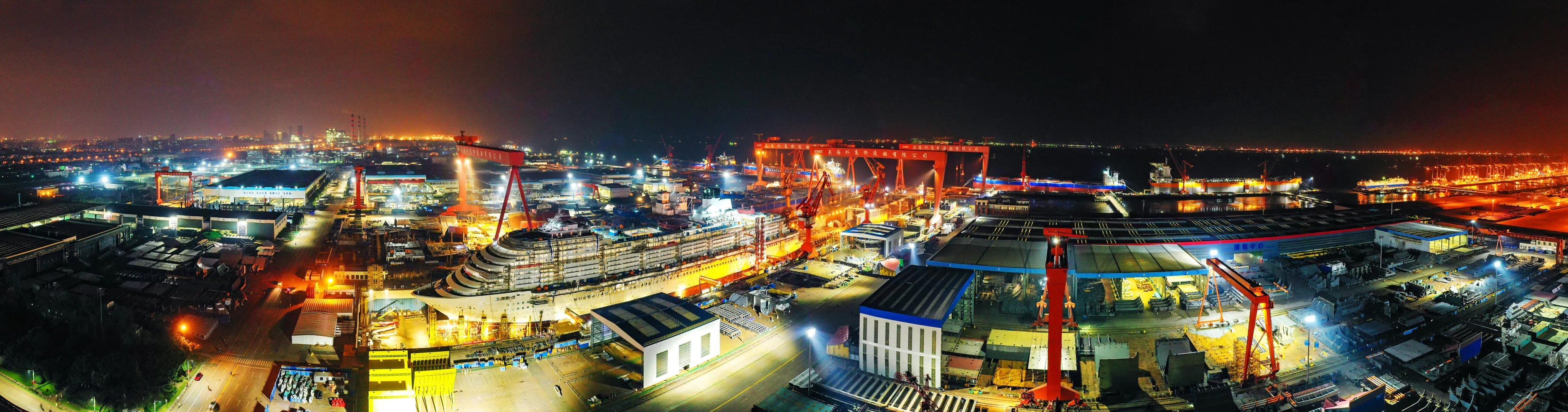 十月金秋结硕果,外高桥造船提前两个半月完成了2021年度交船19艘/座的生产任务,灯火通明的厂区超广角视图充分体现了外高桥造船人持续保障大型邮轮项目高效运行,努力完成民船、海工、邮轮产品的设计建造任务、争取以超额完成全年目标的决心和信心。