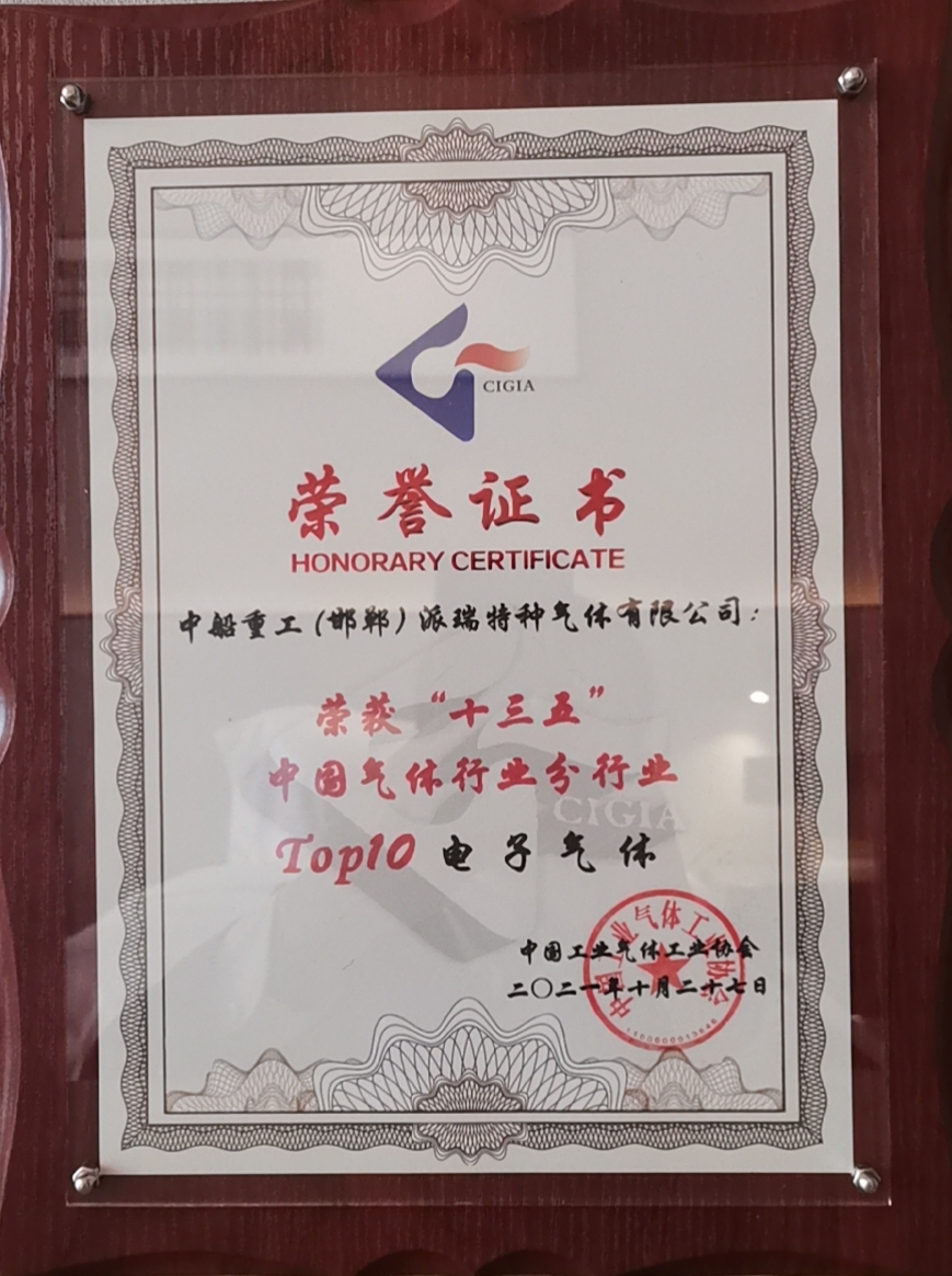 中国船舶集团旗下七一八所所属派瑞特气公司,近日荣获中国工业气体工业协会评选的“十三五”中国气体行业分行业电子气体10强、“十三五”中国气体行业50强企业荣誉称号,以及2021年气体行业专利奖金奖。