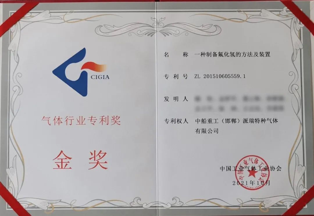 此次获奖,是派瑞特气公司继2020年“一种制备三氟化氮气体的装置及应用”专利获评发明专利金奖后,连续第2年获得该项荣誉。