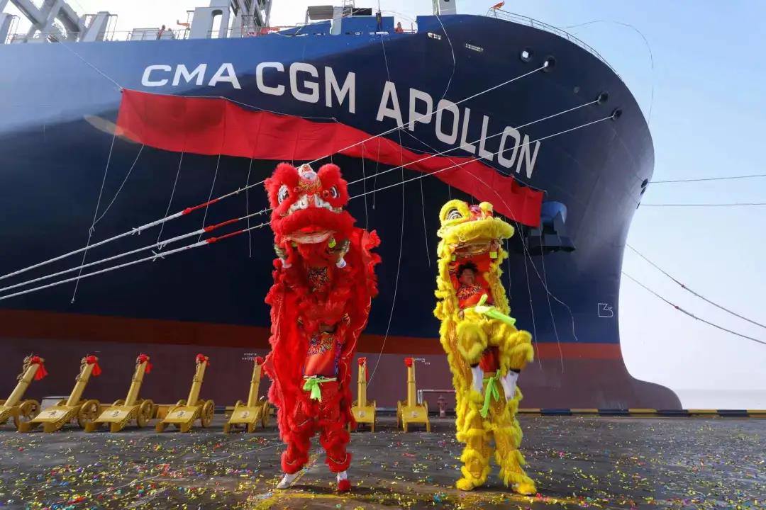 1月4日,新年第一个工作日。沪东中华联合中船贸易为法国达飞海运集团建造的第四艘15000TEU超大型集装箱船系列船“达飞·阿波罗”号在上海命名交付。