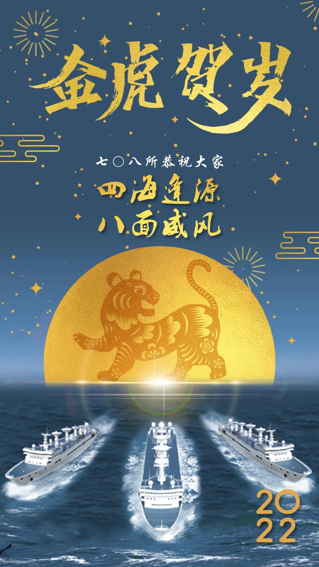 海报以七〇八所自主研发设计的远望号船队、金虎、星空、月亮为元素创作,彰显祖国浩瀚海疆、无垠星空的安宁祥和。四十余年来,远望号船队劈波斩浪,守护着祖国的花好月圆。从远望一号至远望七号,凝结着几代中国船舶人的智慧和汗水,坚守一方“浮动国土”。