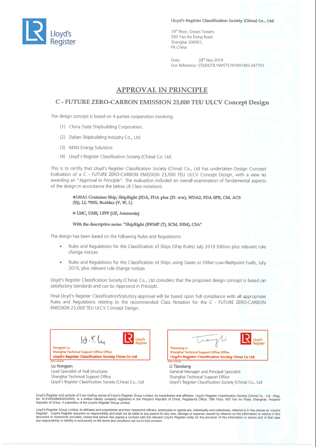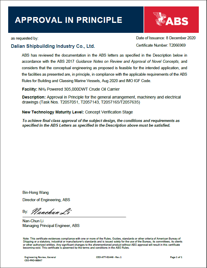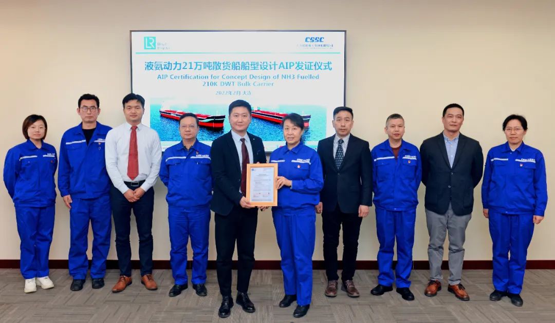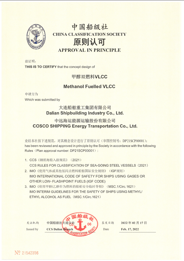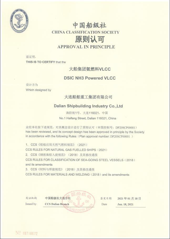 2020年,大船集团研发的液氨动力超大型油船(VLCC)分别取得美国船级社(ABS)和中国船级社(CCS)颁发的AIP证书。