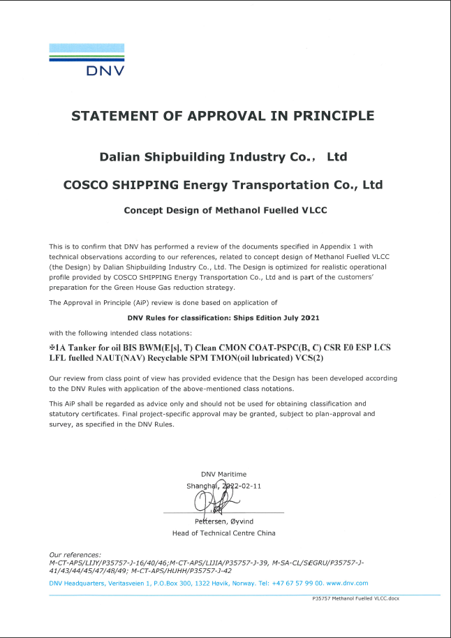 甲醇燃料VLCC分别获得DNV、CCS船级社AIP认可。