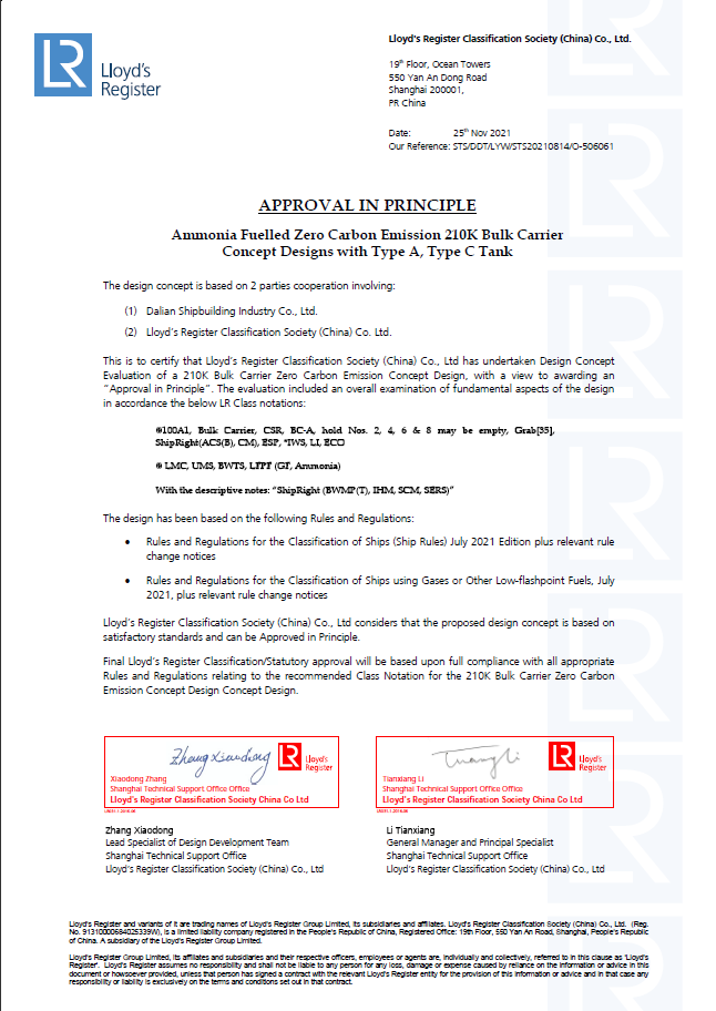 2月25日,中国船舶集团旗下大船集团最新研发的液氨动力21万吨散货船设计方案,获英国劳氏船级社(LR)原则性认可(AIP)证书。