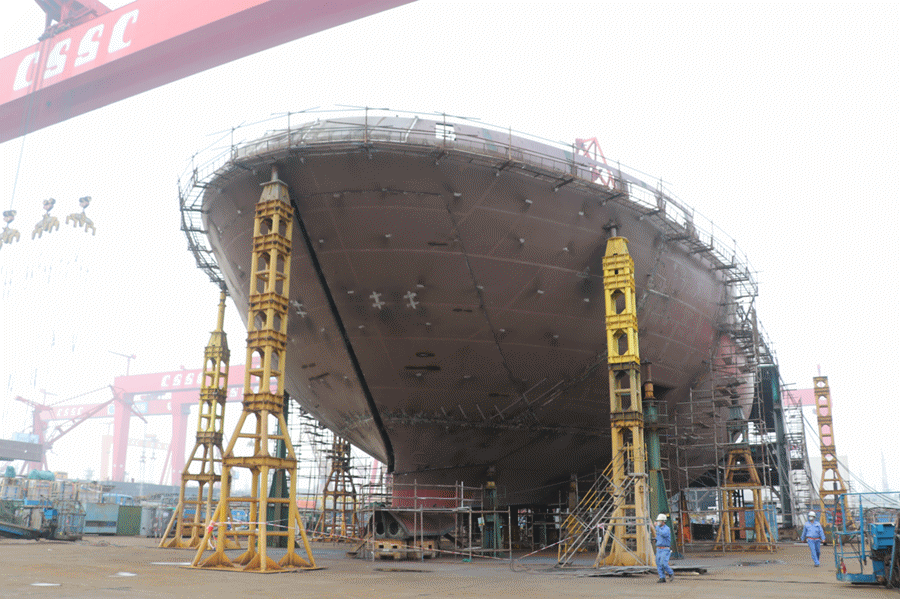 广船国际总装部集中精锐力量,与船东、船检密切配合,克服了疫情影响,实现了艏部总段的快速成型,为艏门开启提供了条件。