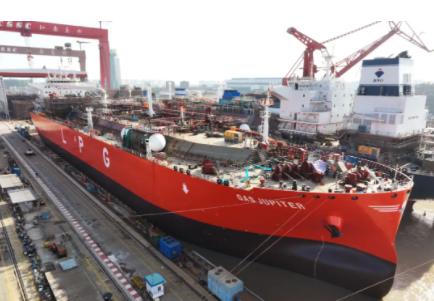 2月15日,在4号坞率先出坞的是江南造船为广东九丰能源集团有限公司建造的国内首制79800立方米Mark III型薄膜式液化天然气(LNG)运输船,以及为天津西南海运有限公司建造的93000立方米超大型液化气船(VLGC)首制船;同时起浮的还有93000立方米VLGC后续半船和即将移位至3号坞的24100TEU超大型集装箱船的艏部巨型环段。同批次的后续作业将转移到3号坞,预计在2月24日,江南造船为地中海航运(MSC)建造的24100TEU超大型集装箱船系列第二艘(H2733船)以及为新加坡Petredec公司建造的93000立方米VLGC系列第二艘(H2736船)出坞,后续两艘半船同步起浮。