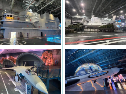 以先进武器装备为原型,馆内建有全比例、高比例航母舰岛、核潜艇、奋斗者号载人深潜器、歼20飞机、运20飞机、天宫空间站、星火号宇宙飞船、99A坦克等,集成声光电、虚拟现实、动感平台等对标国际一线主题乐园的体验技术,采用多种体验形式和手段,编制精彩成长历险故事,以主题游乐、研学教育、科普展示、文创商业等多种业态,为游客带来一场高科技、新技术的军事主题沉浸体验。