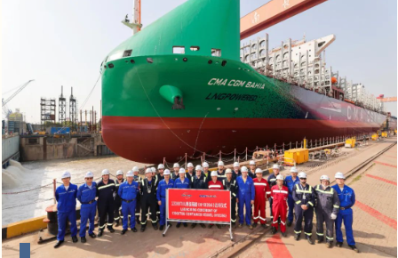 5月15日,中国船舶集团旗下沪东中华为法国达飞集团建造的13000TEU双燃料集装箱船首制船(H1839A)在顺利出坞。该项目共6艘13000TEU双燃料集装箱船,目前首制船出坞,2号3号船坞内建造,4号船燃料舱即将入坞,5号船处于分段制造阶段,6号船于5月4日完成开工。
