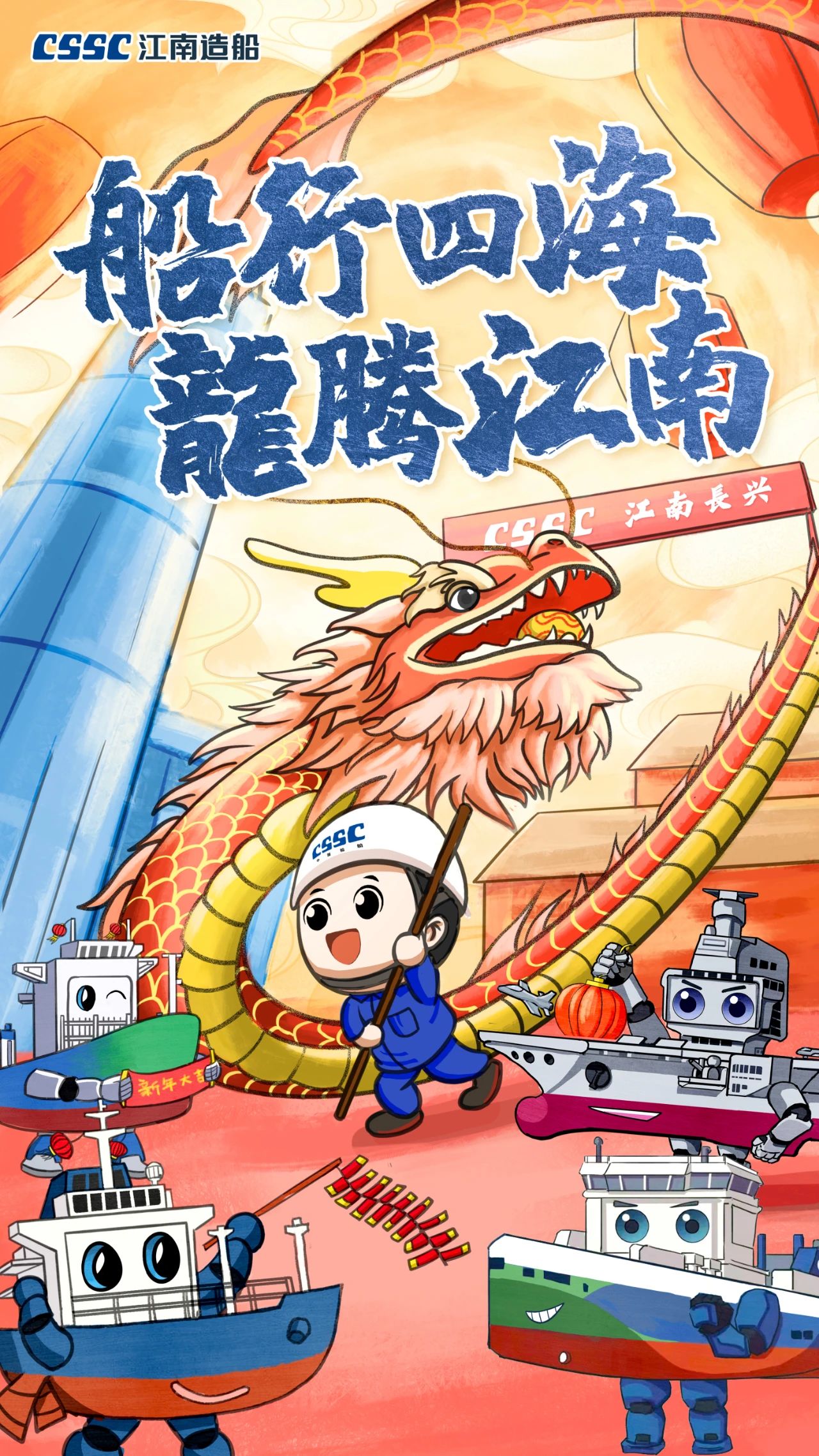 创意说明:海报中“江小南”舞起龙头,预示着在新的一年,江南造船将赓续努力,龙头扬起、再创新绩!而跟随舞动的则是目前江南造船在建的集装箱船、液化气船和汽车滚装船等主产品系列。