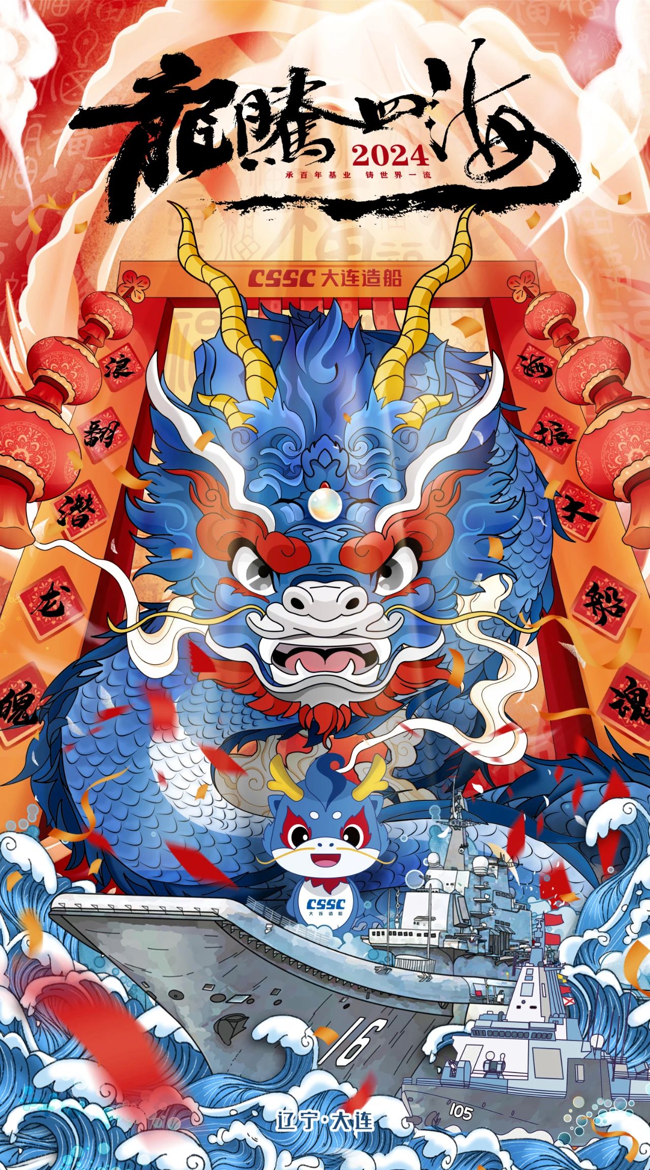 创意说明:采用国潮手绘风格,将中国传统文化元素和大连造船辽宁舰、大连舰等企业特色相结合,以彰显造船龙头企业的荣耀和奋发向上的精神。整体设计采用上中下三个部分的排列方式,比例为1:2:1。