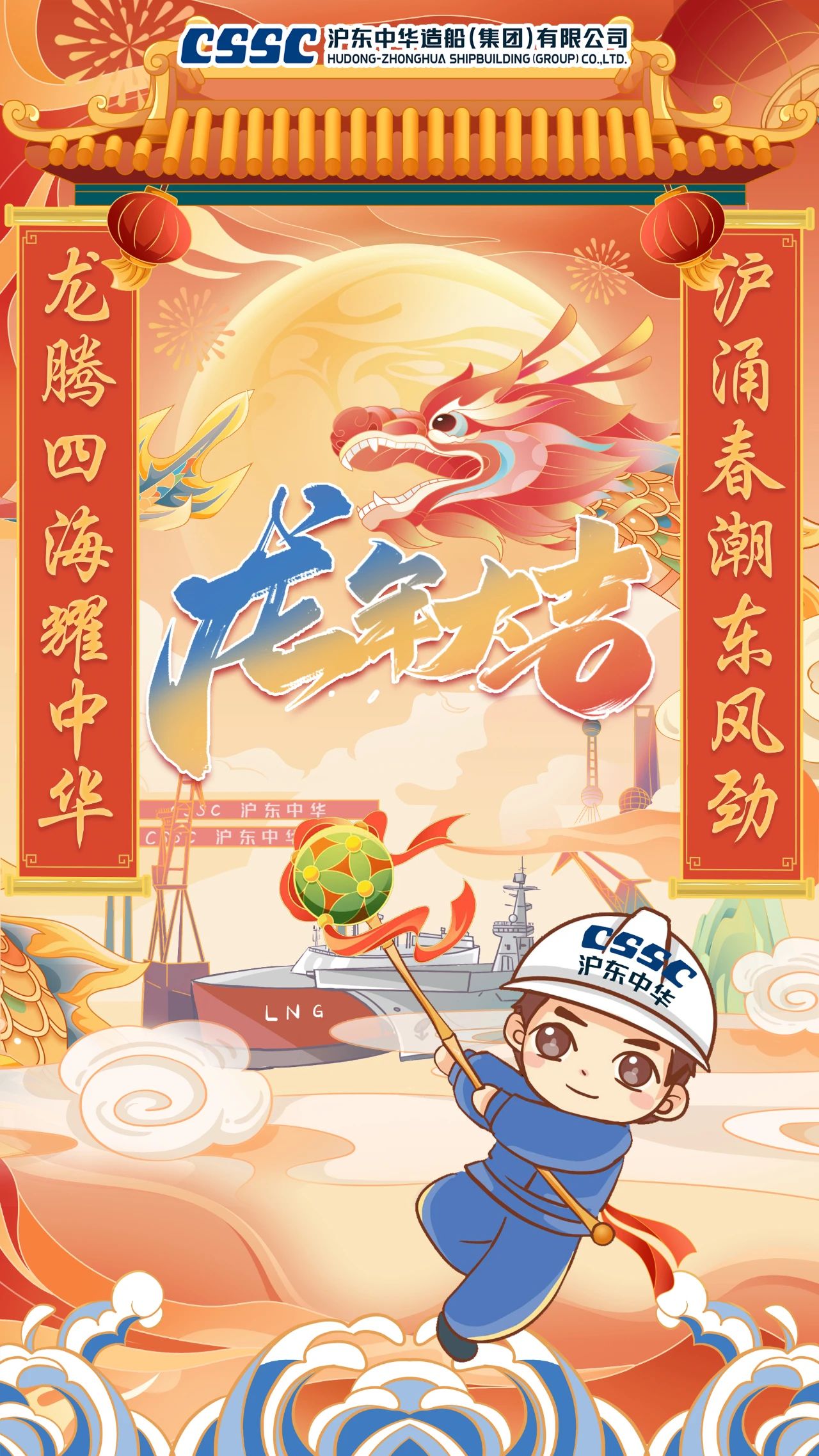 创意说明:海报采用国风设计,以对联形式布局,以舞龙为海报核心。沪东中华员工手持绣球,引导巨龙前行,并打造出LNG运输船等产品,体现了沪东中华追风踏浪、勇攀高峰的志向。