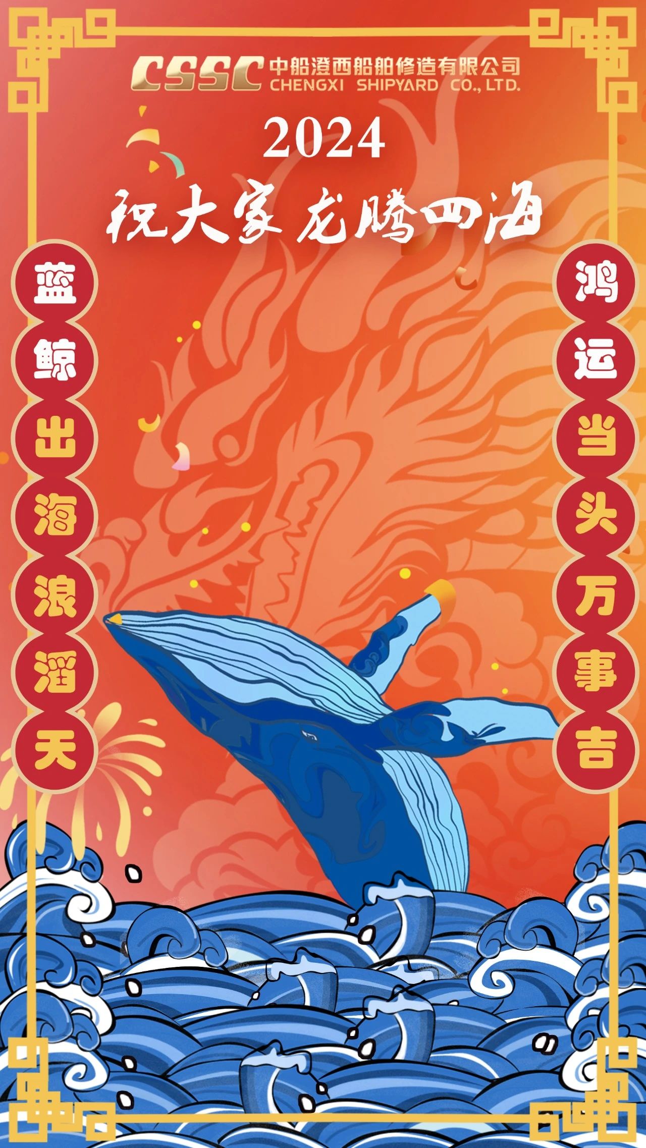 创意说明:海报以龙年为主题,主体为蓝鲸。自研8万吨级散货船“蓝鲸”系列和5万吨级油化船“鸿运”系列是中船澄西命名的品牌船型,凝结了公司全员智慧。