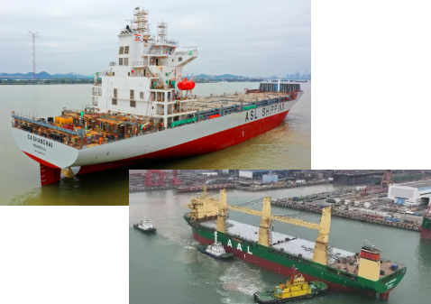 黄埔文冲同日完成2艘船舶出坞节点,包括为亚海航运批量建造的1600TEU系列支线箱船首制船、为AAL SHIPPING公司批量建造的32000DWT重吊船2号船,均为近年来黄埔文冲根据市场需求优化的产品。