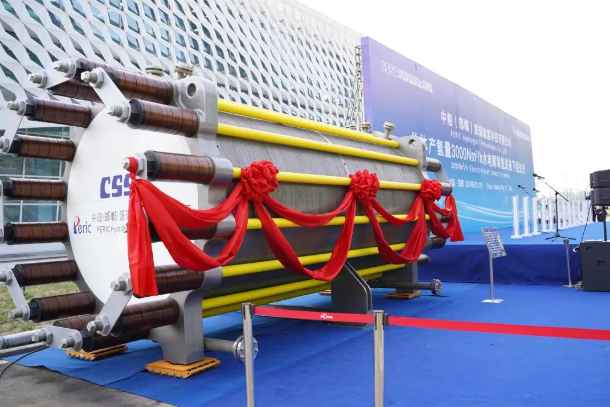 该装备围绕我国氢能高质量发展重大需求,突破了大功率、高电密、宽负载、低电耗等多项前沿技术,实现了单体产氢量由2000Nm³/h到3000Nm³/h的跨越,运行电流密度提升17%,槽体重量降低13%,制氢系统具备30%-110%的动态调节能力,能耗达到国标一级能效标准,可显著提高单机产能、降低生产投入和运行成本,为大规模绿氢制取提供了创新型解决方案。