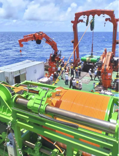 中国船舶集团七〇四所研制的深水重载布放回收绞车助力“开拓二号”布放回收全流程作业,为其刷新纪录等一系列复杂的深海采矿试验提供技术支撑。