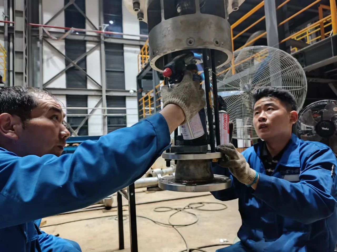 中船发动机——调试人员顶着高温在认真安装传感器,汗水湿透了衣裳。