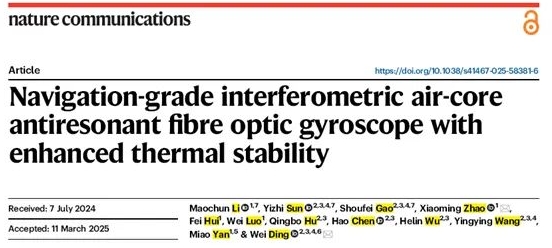 4月14日,中船集团旗下七〇七所和暨南大学等构建的深度合作研究团队,在国际权威顶级期刊《Nature Communications》发表了题为“Navigation-grade interferometric air-core anti-resonant fibre optic gyroscope with enhanced thermal stability”的最新研究成果,实现了空芯光纤陀螺领域的新突破。