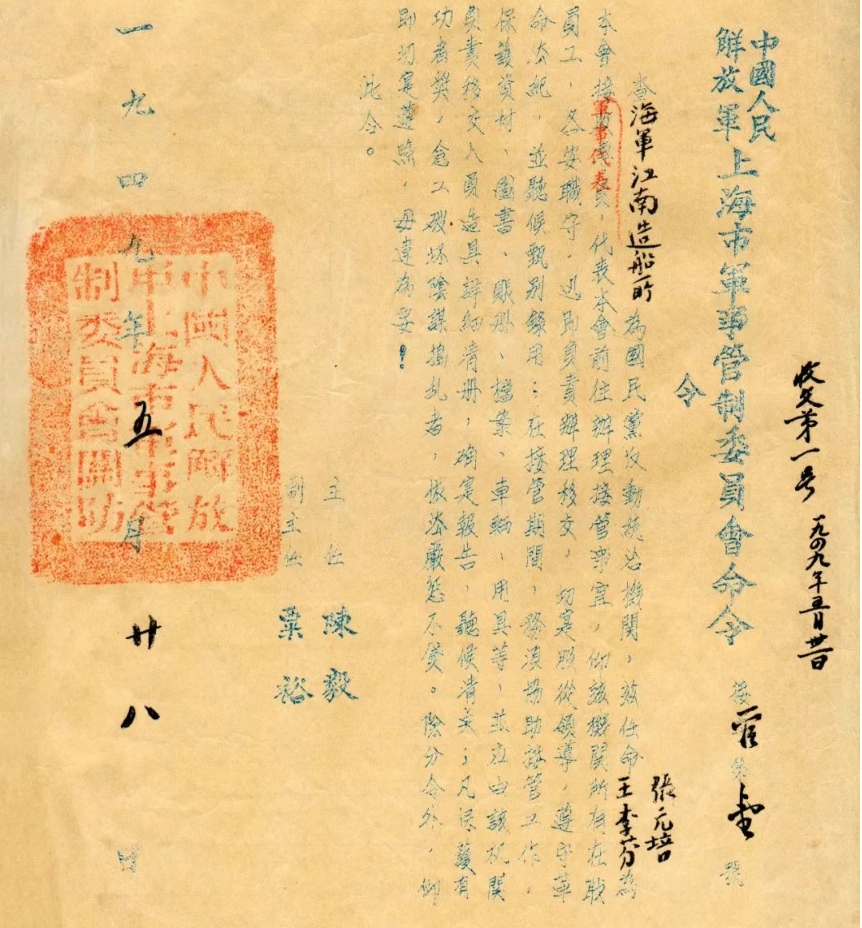 江南之于国家的战略意义,周恩来曾这样说过:“江南造船所是中国乃至亚洲最大的军工企业,要争取在解放军进沪时,安全、完整地交给人民。”1949年5月27日,上海解放。第二天上海市军管会主任陈毅、副主任粟裕签发第一号令,宣布接管海军江南造船所。华东海军司令员张爱萍来到江南造船所和工人们一起投入抢修造船设施的劳动中,江南造船在废墟上获得新生。