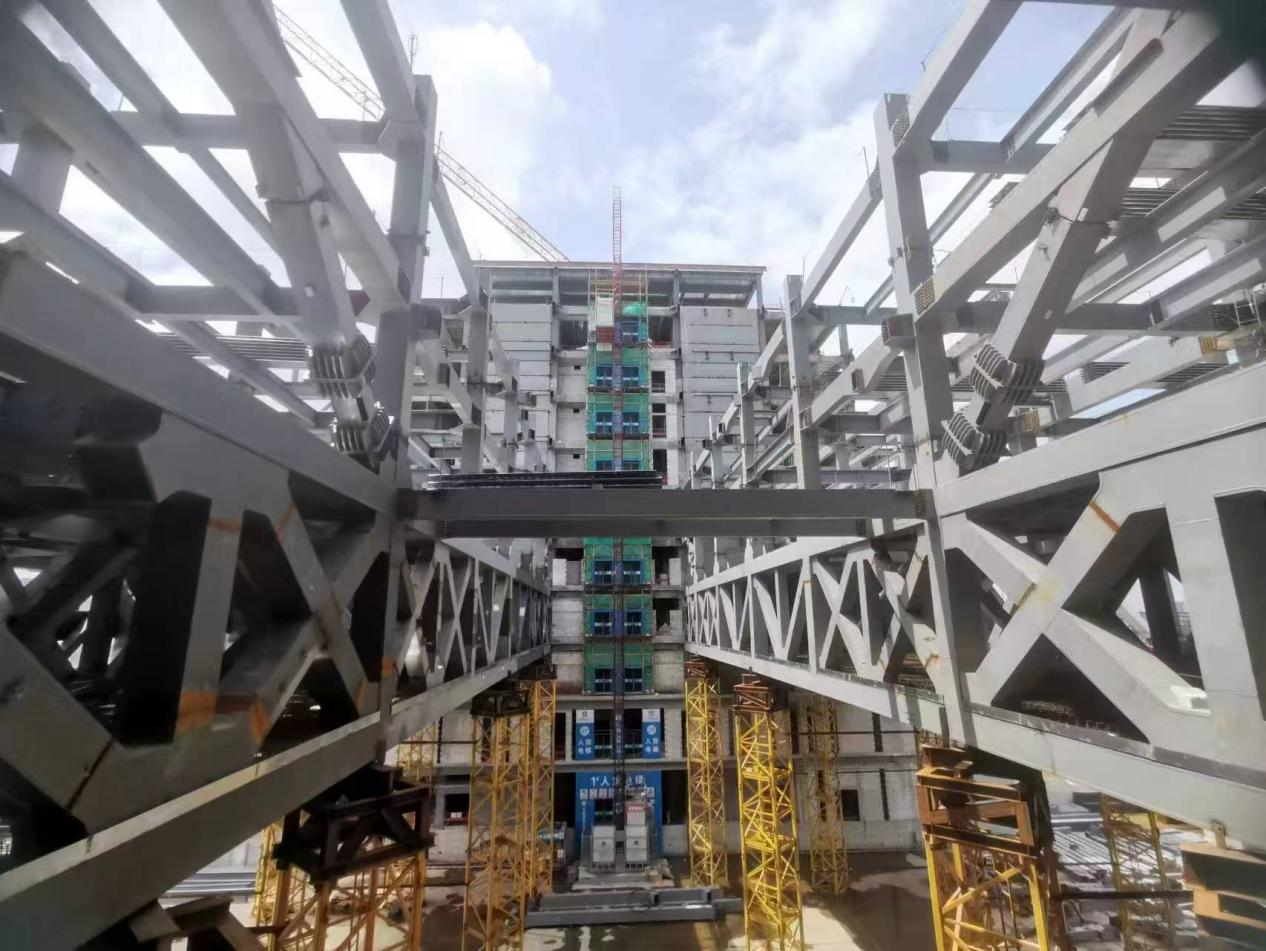 过去五年间,团队肩负双重使命,既要积极探索新兴技术领域,又要紧密贴合实际需求,开展针对性技术攻关。面对大跨度建筑高效承载与装配式钢结构工厂化制造的行业难题,团队深入剖析痛点,历经多次验证、迭代与优化,最终成功突破了技术“瓶颈”,创新研发出获奖专利——“大跨度支座跨中协同预应力箱形连续钢梁柱结构”。该新型结构可优化结构受力分布,显著提升弹性承载力,有效减少钢梁跨中挠度与支座变形,既增强了大跨度建筑韧性,又满足了受损建筑快速功能恢复的特殊需求。为不断提升自身技术水平,团队还积极开展交叉学科研究,在技术与进度双重压力的严峻考验下,凭着“死磕”到底的韧劲,各司其职、紧密协作,共同推动了多项配套产品的成功研发与落地,为行业整体技术革新贡献了重要力量。