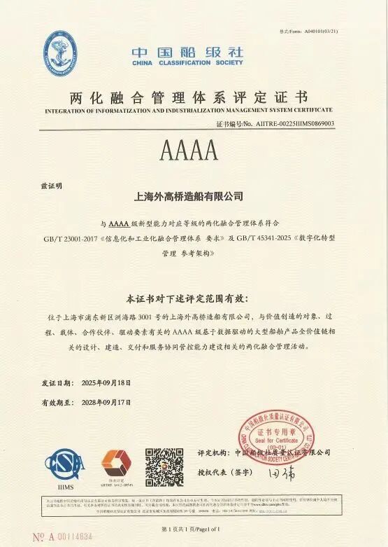 日前,全国两化融合管理体系评定工作委员会公布两化融合管理体系3.0和数字化转型管理体系首批4A/5A级评定企业名单,中国船舶集团有限公司旗下外高桥造船成为首批29家获证的企业之一,也成为首批获得4A级认证的船海企业。