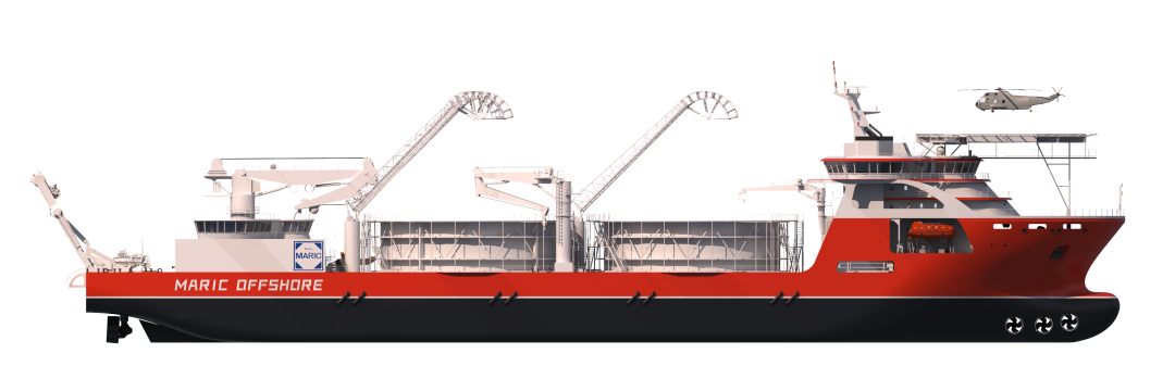 MARIC-CLV 22000海缆施工船采用双转盘设计,最大载缆量达22000吨,最大作业水深可达3000米,满足五级海况下的高效布缆作业。