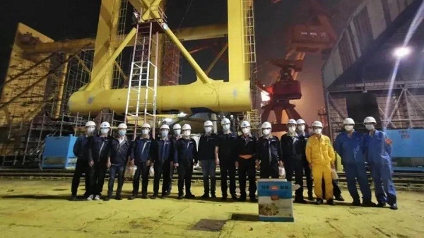 同一天,随着最后一块防沉平台箱梁分段顺利吊装,黄埔文冲非船团队已经连续奋战十天十夜。至此,为保利长大公司建造的明阳华西单桩稳桩平台主体工程