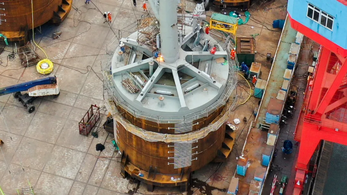7月31日,广船国际建造的我国第一台吸力筒导管架风机基础,在广州南沙成功发运。吸力筒导管架是海上风电场的基础设备,这次交付的吸力筒导管架总高63米,足有20层楼的高度,总重量约为1560吨,相当于15辆重型卡车满载的重量,由3个直径约为13米、高约11米的吸力筒和高52米的上部导管架组成。
