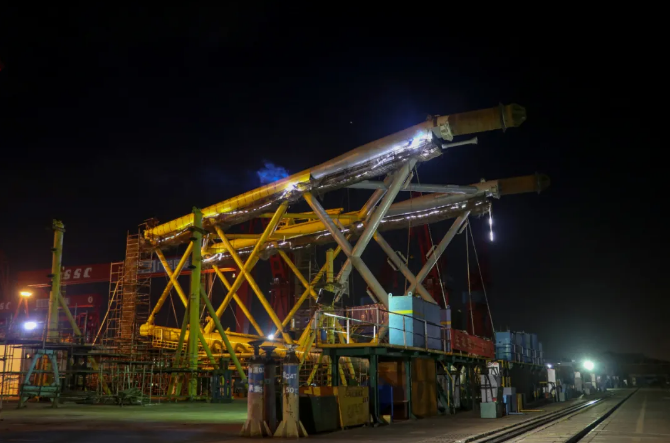 吸力筒导管架风机基础交付后将用于广东省阳江市阳西县沙扒湾300兆瓦海上风电项目。