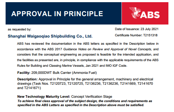 日前,中国船舶集团旗下外高桥造船自主研发设计的21万吨氨燃料动力散货船获得美国船级社(ABS)颁发的原则性认可证书(AIP)。作为具有潜力的零碳燃料,氨燃料能满足更加严格的温室气体排放要求,是未来脱碳航运业中最有希望的替代燃料之一。氨燃料动力船型的推出,为航运业提供一种零碳运输的环保新方案。