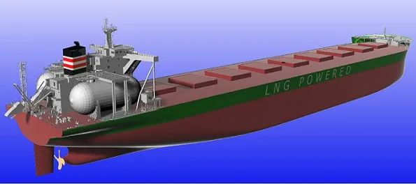 18万吨好望角型双燃料散货船由外高桥造船自主设计,采用LNG燃料和传统燃料油驱动,共配置两个C型LNG燃料罐,可一次性满足完成中国至澳大利亚航线两个来回或中国至巴西航线一个来回的路程需求。在LNG燃料模式下,该船基本消除颗粒物和硫化物的排放,满足国际海事组织IMO第四阶段规范要求,具有绿色、环保、节能、安全等显著特色。
