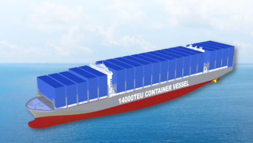 14000TEU甲醇燃料预留大型集装箱船总长约336米,型宽 51米,型深30.2米,可装载14170个20英尺标准集装箱。采用最新设计理念,在常规燃料动力推进系统基础上,预留甲醇燃料推进方案,可满足船东后续绿色燃料改装的需求。同时,配置脱硫塔及其他节能装置,具有综合能耗低、船舶快速性强和绿色环保优等特点,总体性能达到世界先进水平,计划于2026至2027年完工交付。