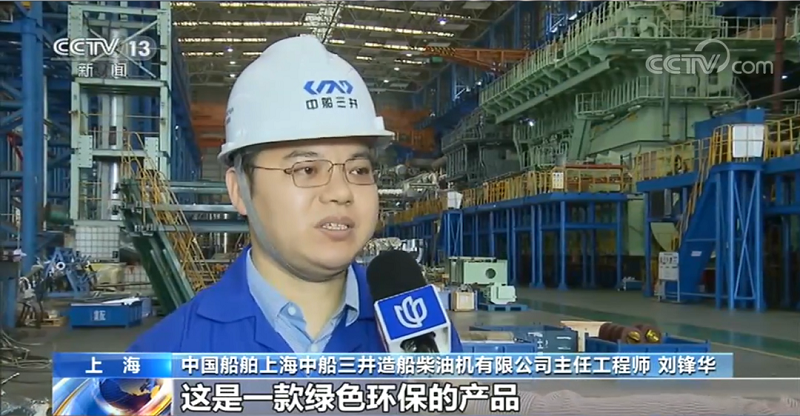 中国船舶上海中船三井造船柴油机有限公司主任工程师 刘锋华:尺寸最大,达到了5层楼那么高,功率达到了63800多千瓦,功率也是最大的。这是一款绿色环保的产品,使用燃气运行时氮氧化物的排放不到常规发动机的十分之一,硫氧化物和颗粒物的排放也是非常好的,不用装任何后处理设备,都可以满足IMO(国际海事组织)最新的排放法规要求。