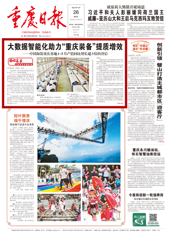 近日,重庆日报头版头条以《大数据智能化助力“重庆装备”提质增效——中国海装重庆基地1-5月产值同比增长超3倍的背后》,为题对中国船舶集团旗下中国海装进行了报道,文章对后疫情时代,中国海装如何履行央企责任,做好“六稳”工作,落实“六保”任务,助力重庆装备制造业稳步复苏,奋力实现高质量发展的举措与成效进行了深入分析。