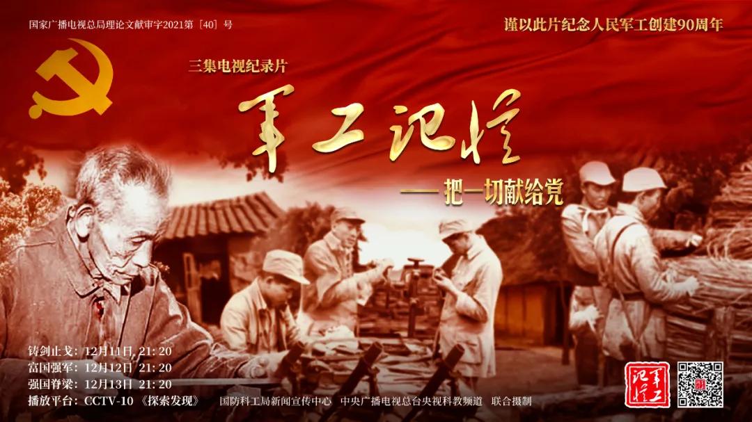 为庆祝中国共产党成立100周年,纪念党领导下的人民军工创建90周年,由国防科工局指导,国防科工局新闻宣传中心联合中央广播电视总台社教节目中心摄制,各军工集团大力支持的3集重大理论文献电视纪录片《军工记忆——把一切献给党》,将于12月11日21:20在央视科教频道(CCTV-10)《探索发现》栏目首播,连续播出3天。该纪录片旨在向建党百年献礼,向人民军工90周年致敬,向全社会弘扬军工精神传递军工文化,激励国防科技工业战线广大干部职工不忘初心、接续奋斗,为实现强军强国梦想贡献力量。