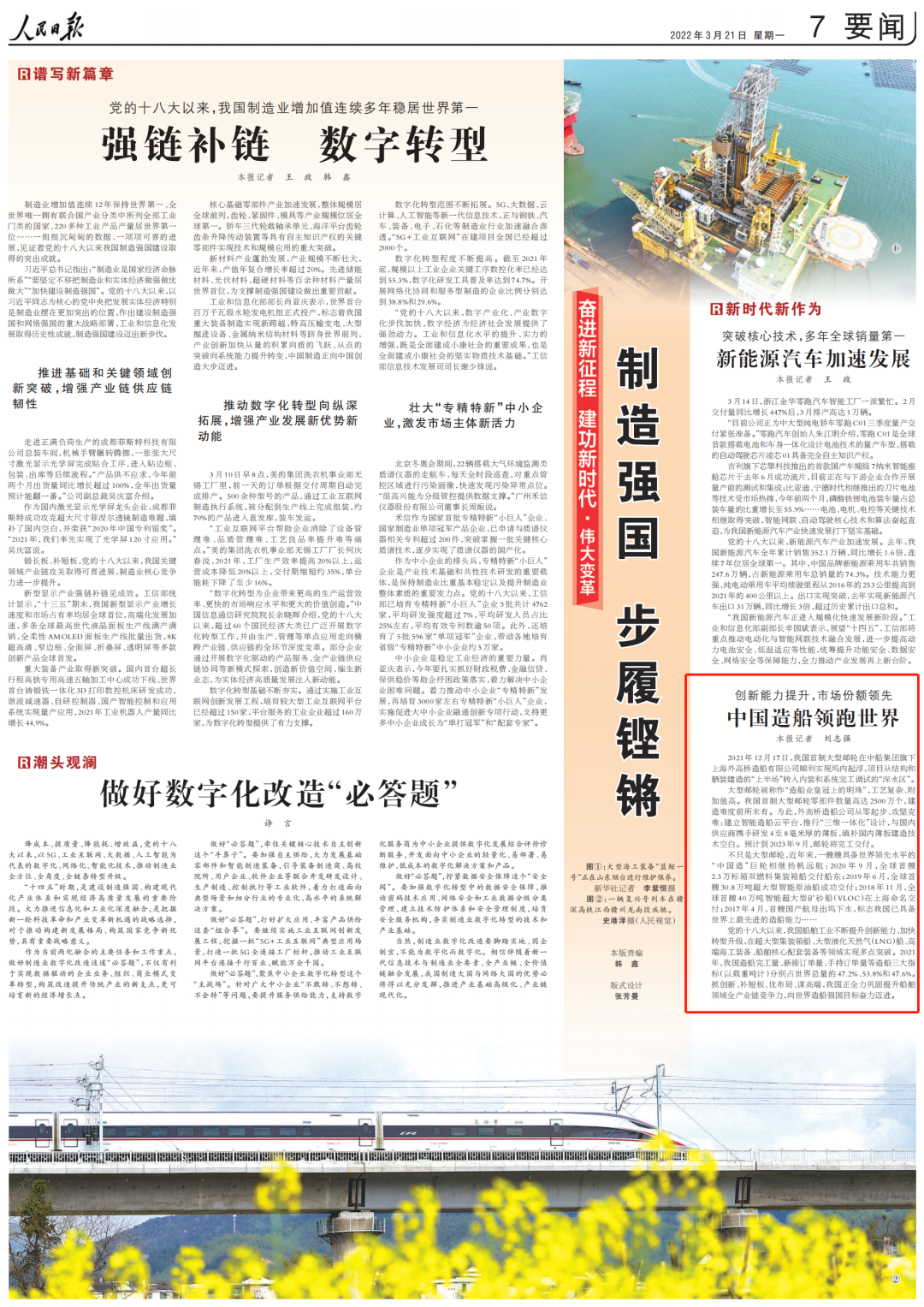 党的十八大以来,我国船舶工业不断提升创新能力、加快转型升级,在超大型集装箱船、大型液化天然气(LNG)船、高端海工装备、船舶核心配套装备等领域实现多点突破。2021年,我国造船完工量、新接订单量、手持订单量等造船三大指标(以载重吨计)分别占世界总量的47.2%、53.8%和47.6%。抓创新、补短板、优布局、谋高端,我国正全力巩固提升船舶领域全产业链竞争力,向世界造船强国目标奋力迈进。