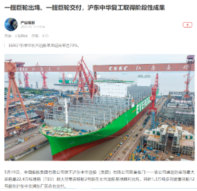 5月19日,中国船舶集团旗下沪东中华双喜临门。其建造的全球最大装箱量24000TEU超大型集装箱船2号船在长兴造船基地顺利出坞;建造的13000吨多用途重吊船12号船在浦东厂区命名交付,标志着该项目圆满收官。这是沪东中华自复工复产以来首次实现一天完成两大生产节点。