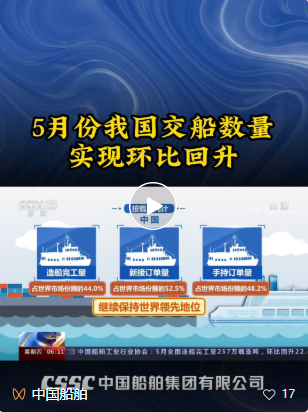 6月15日,中国船舶工业行业协会公布了今年前五个月我国船舶工业的运行数据。数据显示,今年前五个月,我国船舶工业生产经营逐步企稳回升。五月份,交船数量实现环比回升。