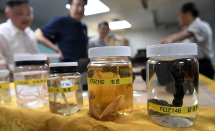3月11日,“探索一号”科考船携“奋斗者”号全海深载人潜水器抵达三亚,科研人员在介绍采集的深渊宏生物、岩石、结核、沉积物样品。新华社记者 陈凯姿 摄