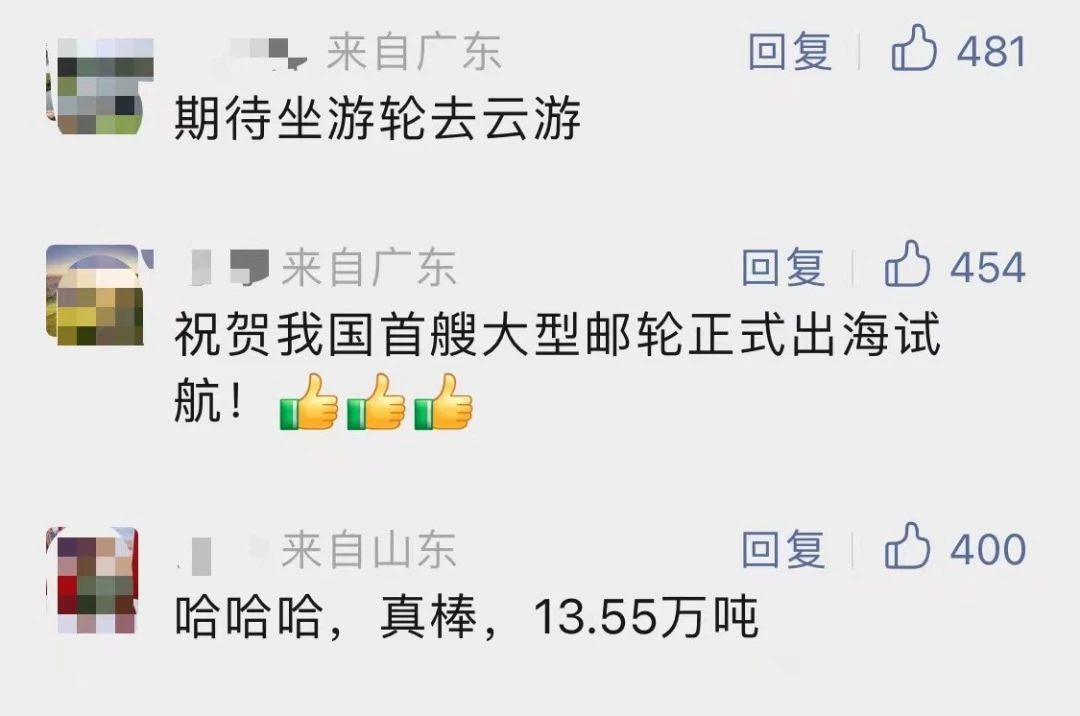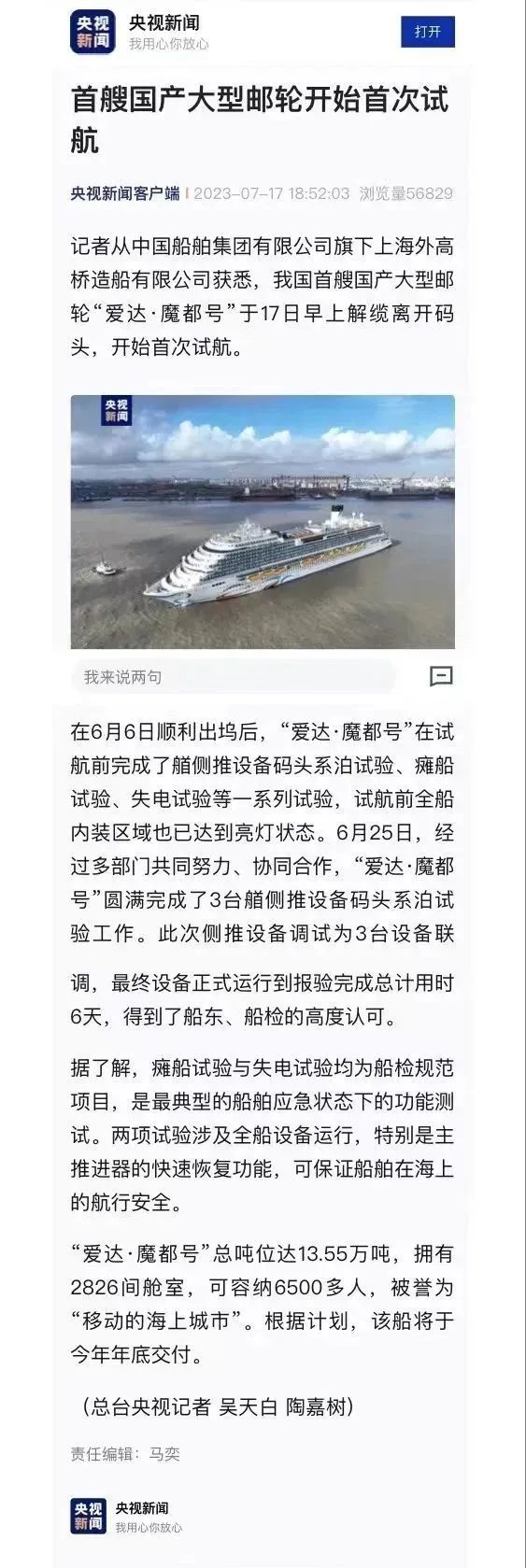 国产首制大型邮轮试航 各大媒体齐齐关注 ↓↓↓ 人民日报: 新华社: 央视新闻: 环球时报: 网友齐刷刷举起小手手: 要上船!要上船! 让我们一起期待 “爱达·魔都号” 试航凯旋!