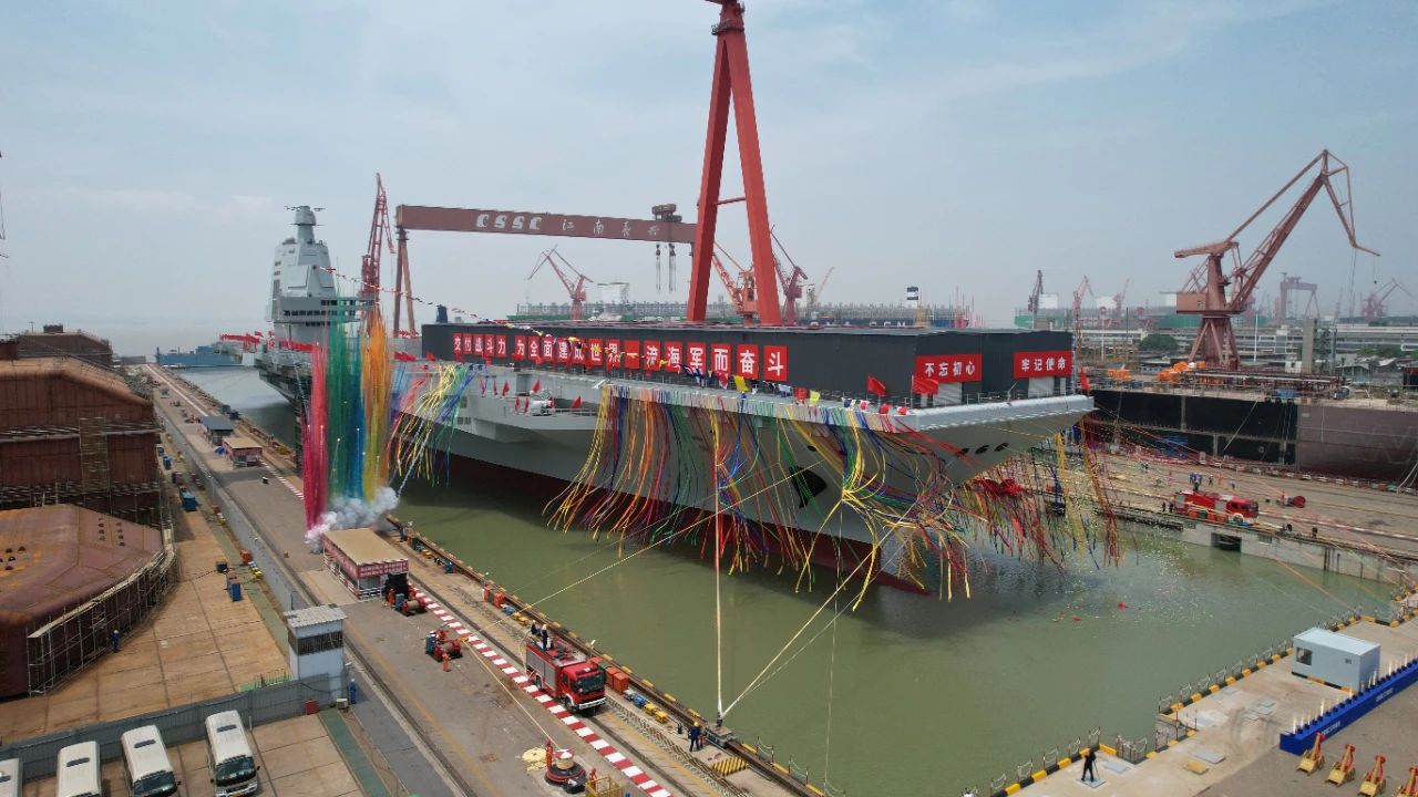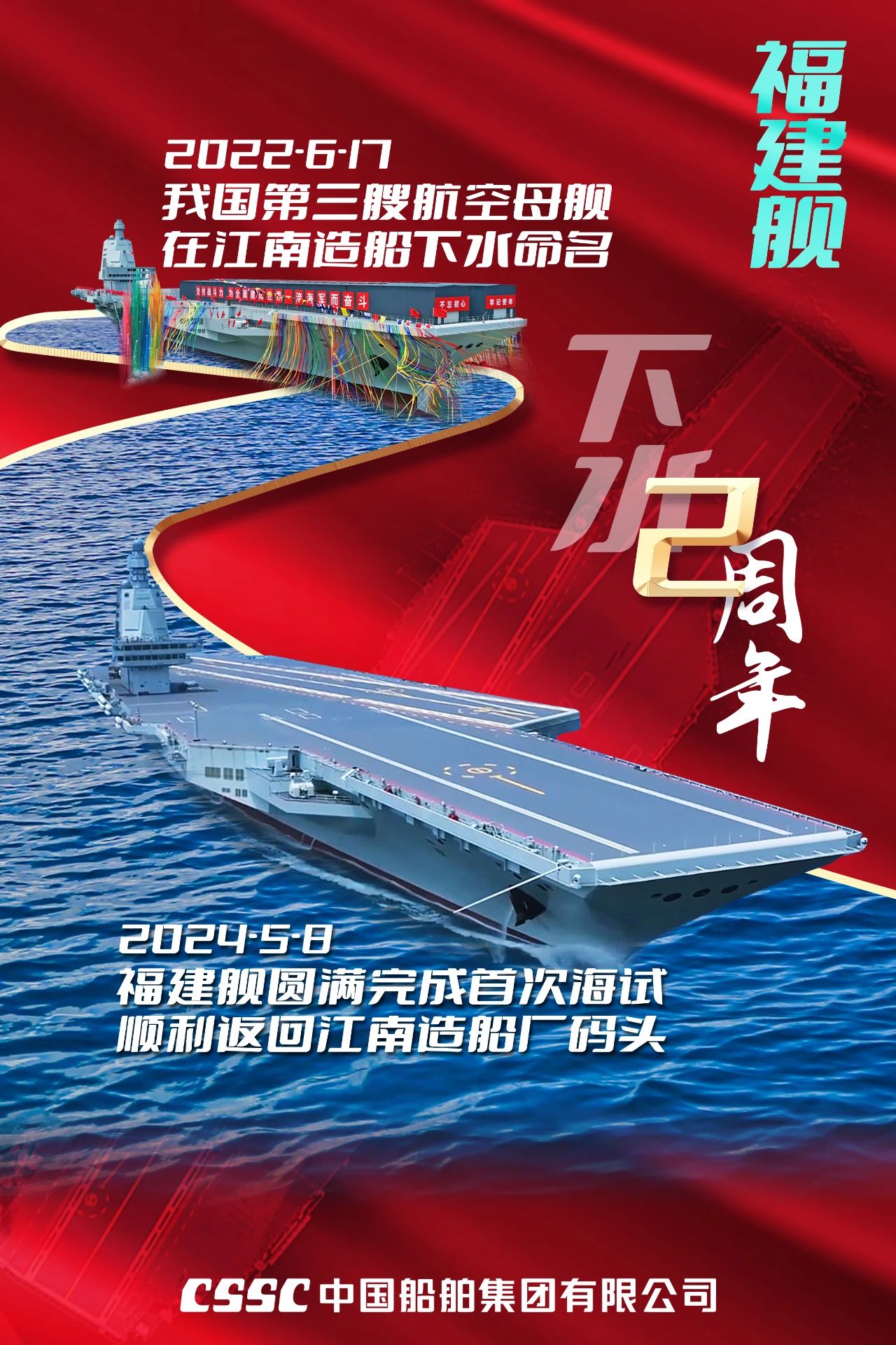 两年前的今天,我国完全自主设计建造的首艘弹射型航空母舰——福建舰,在中国船舶集团有限公司江南造船厂下水。