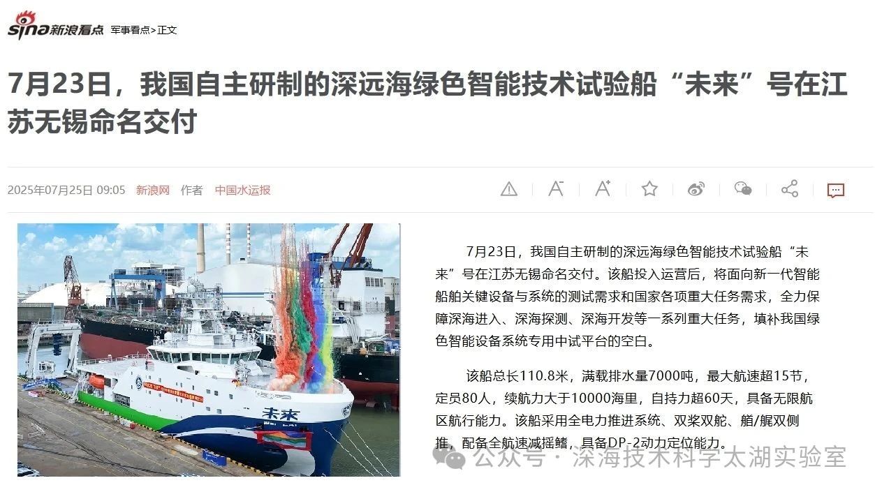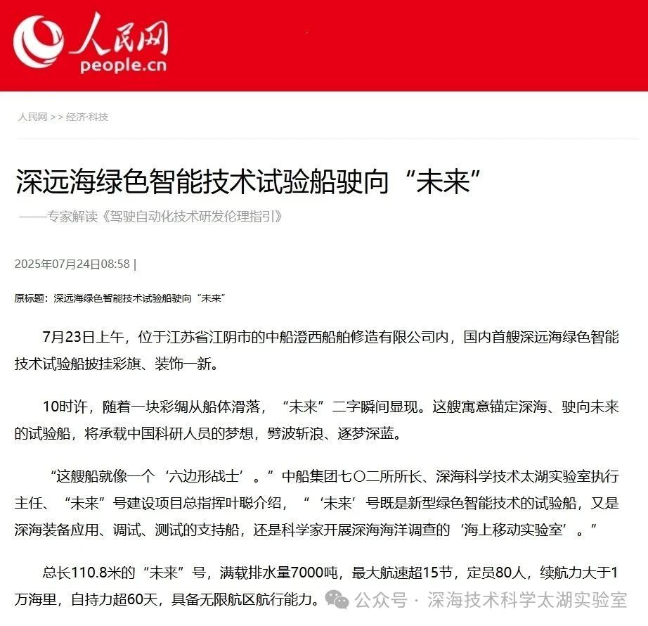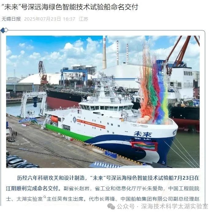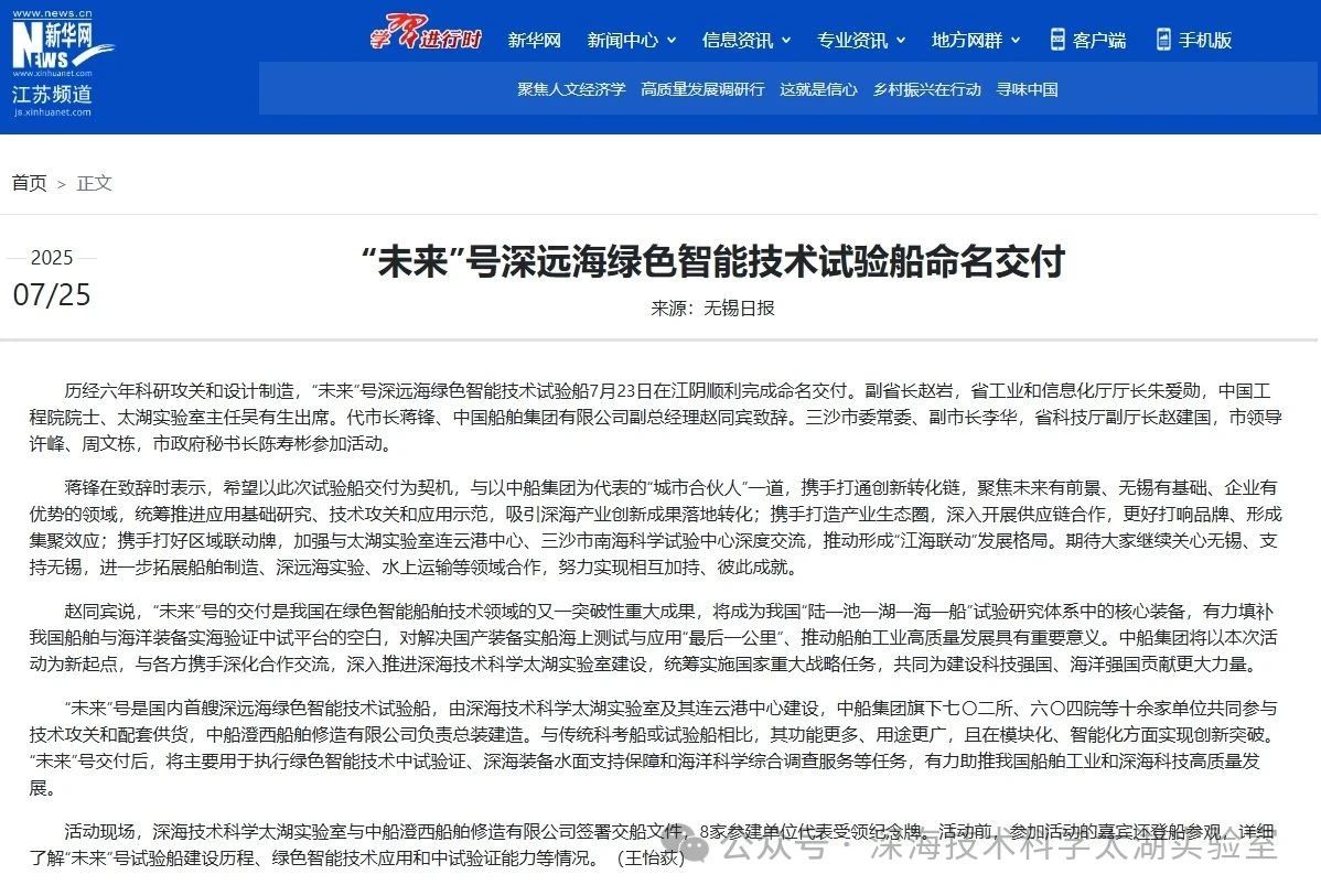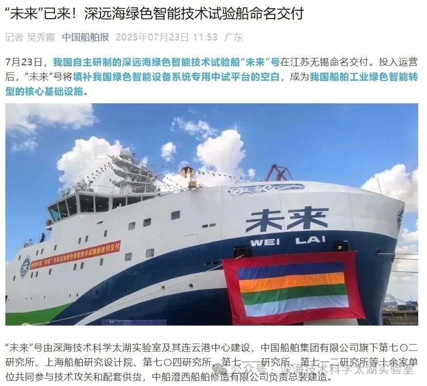 7月23日,由深海技术科学太湖实验室历时六年科研攻关和设计建造的“未来”号正式命名交付。中船集团旗下七〇二所、上船院、七〇四所、七一一所、七一二所等十余家单位共同参与技术攻关和配套供货,中船澄西负责总装建造人民日报、新华社、央视新闻、科技日报等主流媒体共同聚焦这一“国之重器”。