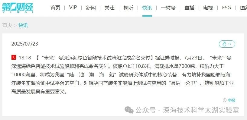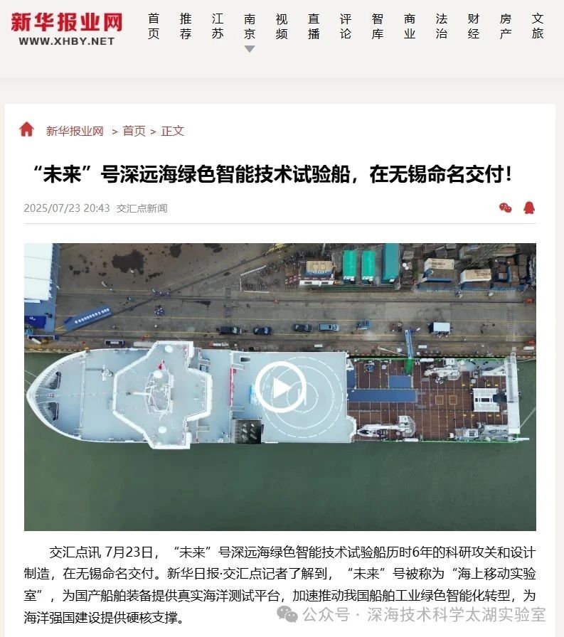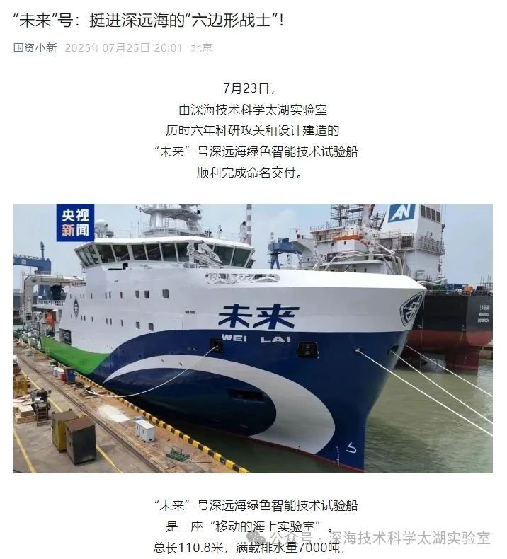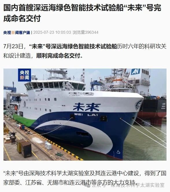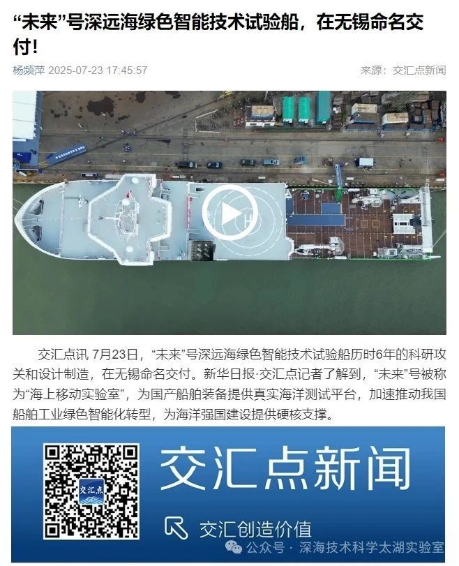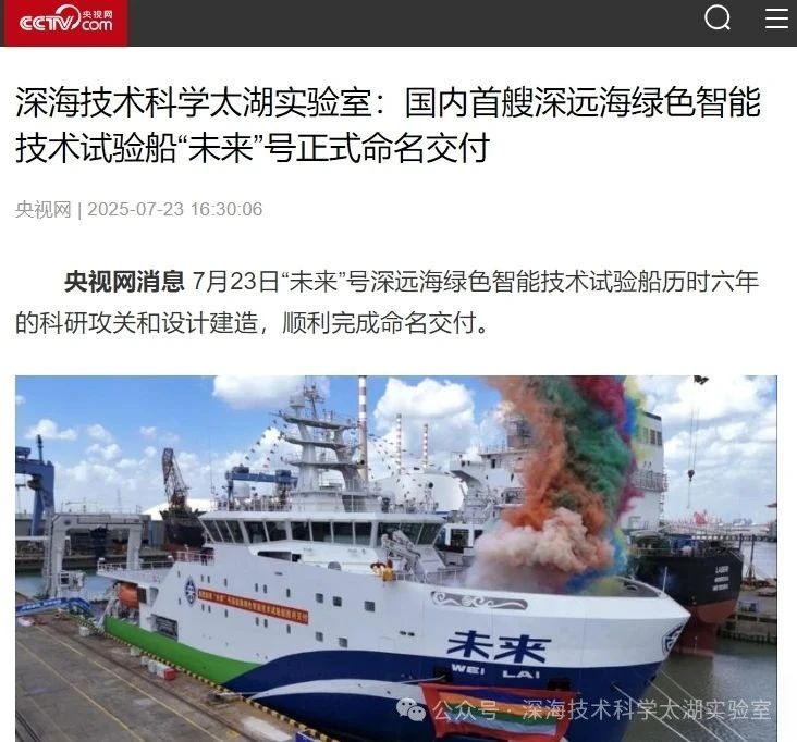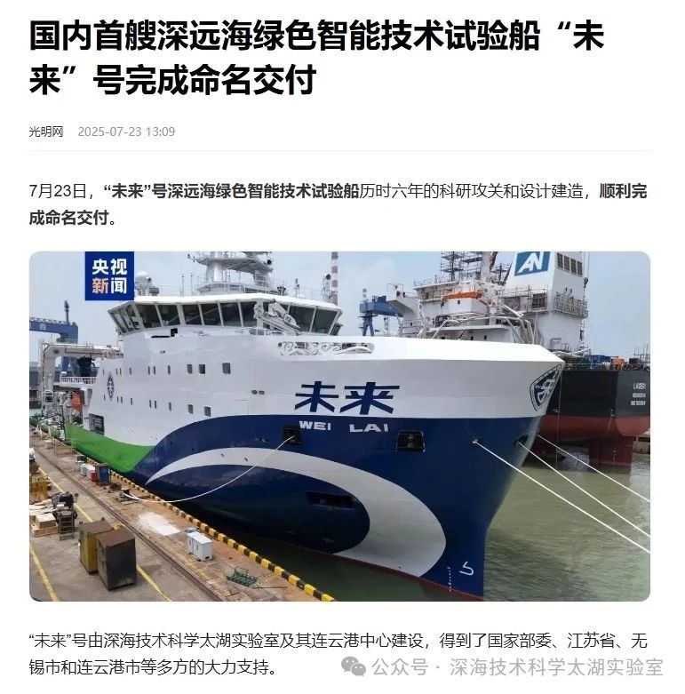 7月23日,由深海技术科学太湖实验室历时六年科研攻关和设计建造的“未来”号正式命名交付。中船集团旗下七〇二所、上船院、七〇四所、七一一所、七一二所等十余家单位共同参与技术攻关和配套供货,中船澄西负责总装建造人民日报、新华社、央视新闻、科技日报等主流媒体共同聚焦这一“国之重器”。