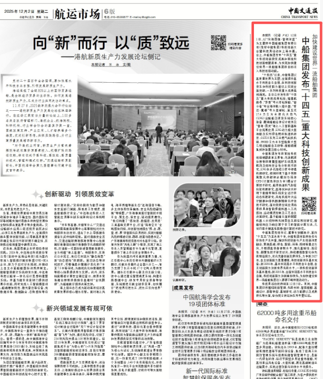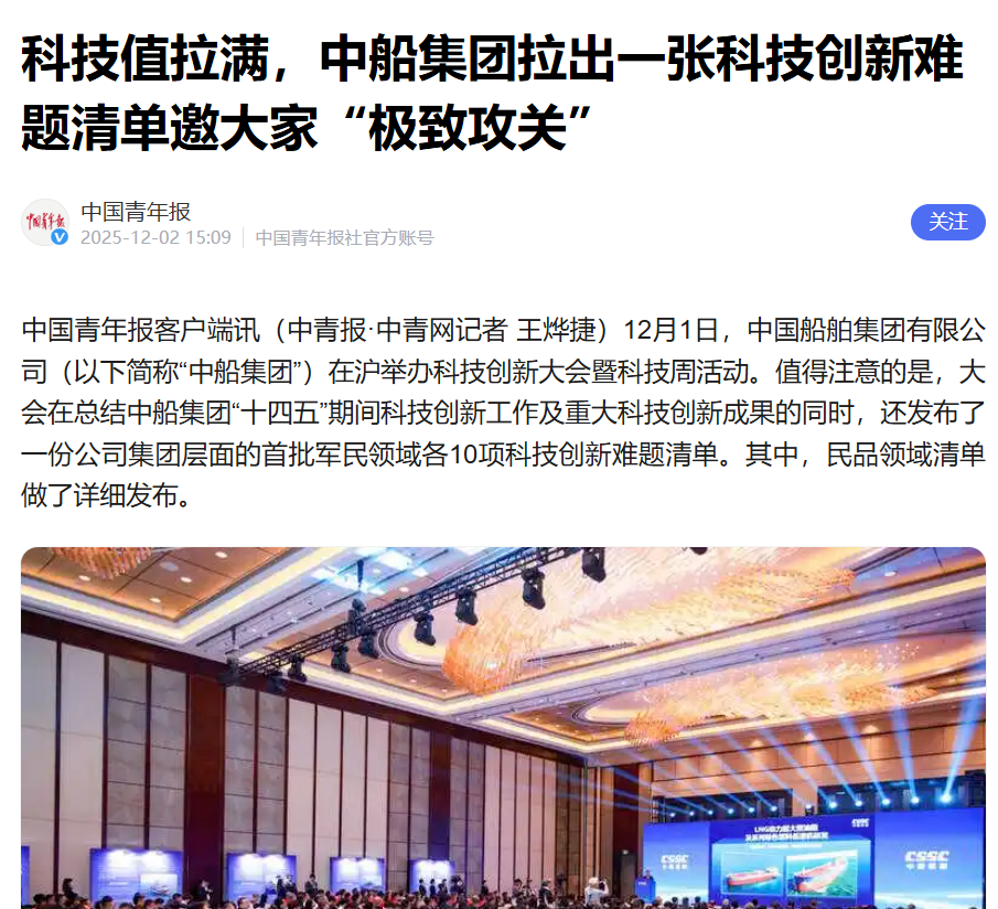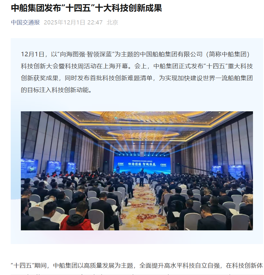 此次大会聚焦“向海图强·智领深蓝”主题,系统总结了中船集团“十四五”期间科技创新工作及重大科技创新成果,谋划“十五五”科技发展规划,引发中央、行业及地方媒体的广泛关注报道。