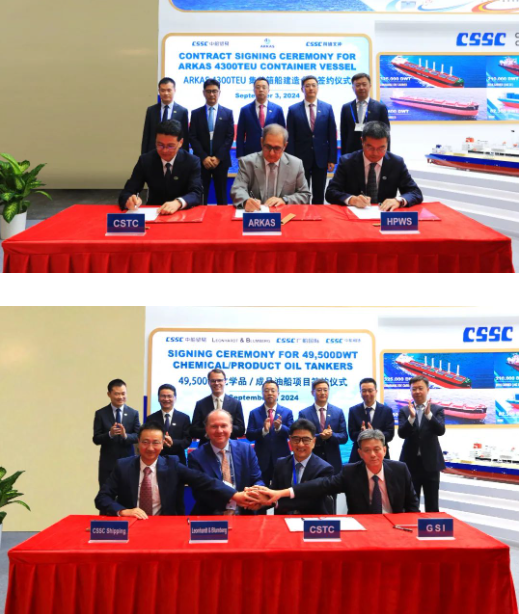 此次展会上,集团公司有关成员单位负责人率队赴展会开展重点船海项目经营洽谈并拜访当地和周边国家主要客户。集团公司以“高端绿色、领跑未来”为参展主题,展台设置了集团总体区、高端绿色船舶区、先进动力配套区共3个展示区域,重点展示了首艘国产大型邮轮、27.1万立方米超大型LNG(液化天然气)运输船、10800车LNG双燃料汽车运输船、全球首艘LNG双燃料VLCC(超大型油船)、21万吨氨燃料散货船、9.3万立方米超大型全冷式液化气船等一系列技术含量高、全球竞争力强的高端绿色船型,以及CPGC-WinGD 10X92DF-M甲醇双燃料发动机、船用供气系统、船用碳捕捉系统、船舶新能源动力系统解决方案等满足IMO(国际海事组织)当前和未来排放要求的先进动力配套设备,充分彰显了中国船舶集团的国际化品牌形象及引领国际船舶市场创新发展的澎湃动力。