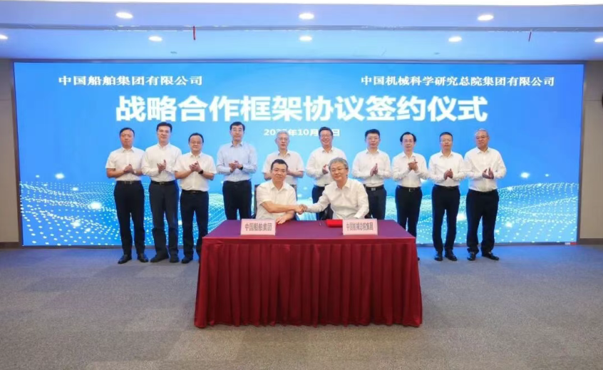 10月17日,中国船舶集团有限公司与中国机械科学总院集团有限公司在上海签署战略合作框架协议。中船集团党组书记、董事长徐鹏,中国机械总院党委书记、董事长王德成出席签约仪式。中船集团党组成员、副总经理彭原璞,中国机械总院集团副总经理姜超分别代表双方在协议上签字。签约前,双方就进一步加强沟通交流、深化多领域合作进行了交流探讨。