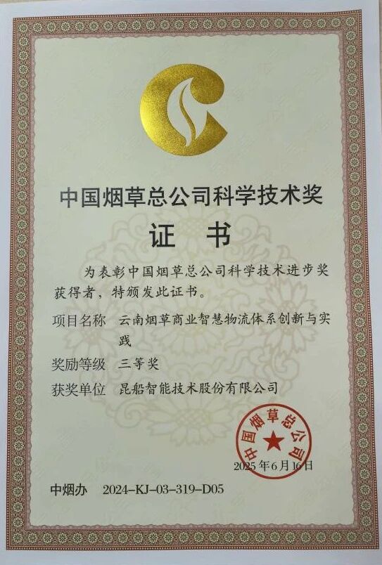 近日,中船集团旗下昆船公司所属昆船智能协同相关单位及高校申报的“云南烟草商业智慧物流体系创新与实践”项目成果获得中国烟草总公司科技进步奖三等奖。