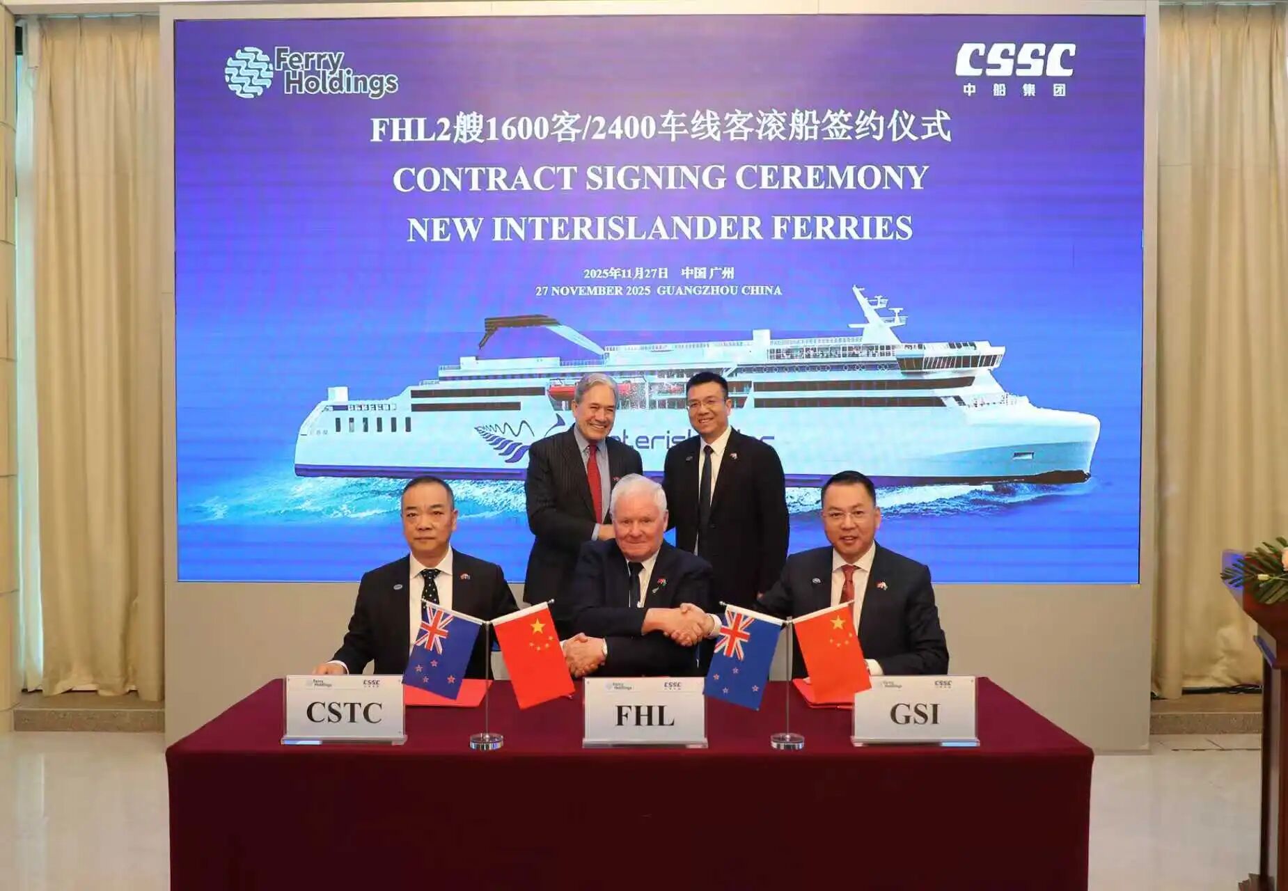 11月27日,中国船舶集团有限公司旗下广船国际有限公司携手新西兰FHL(Ferry Holdings)公司签署2艘新型客滚船建造合同。当天签约的客滚船项目,是连接中新两国友谊的重要纽带。在中船集团与FHL公司携手推动下,双方共赢合作迈出了关键一步。